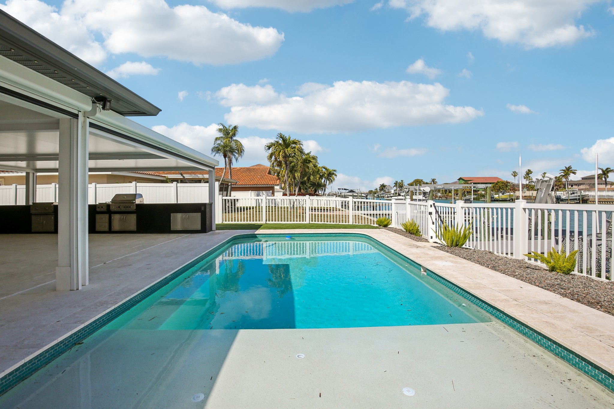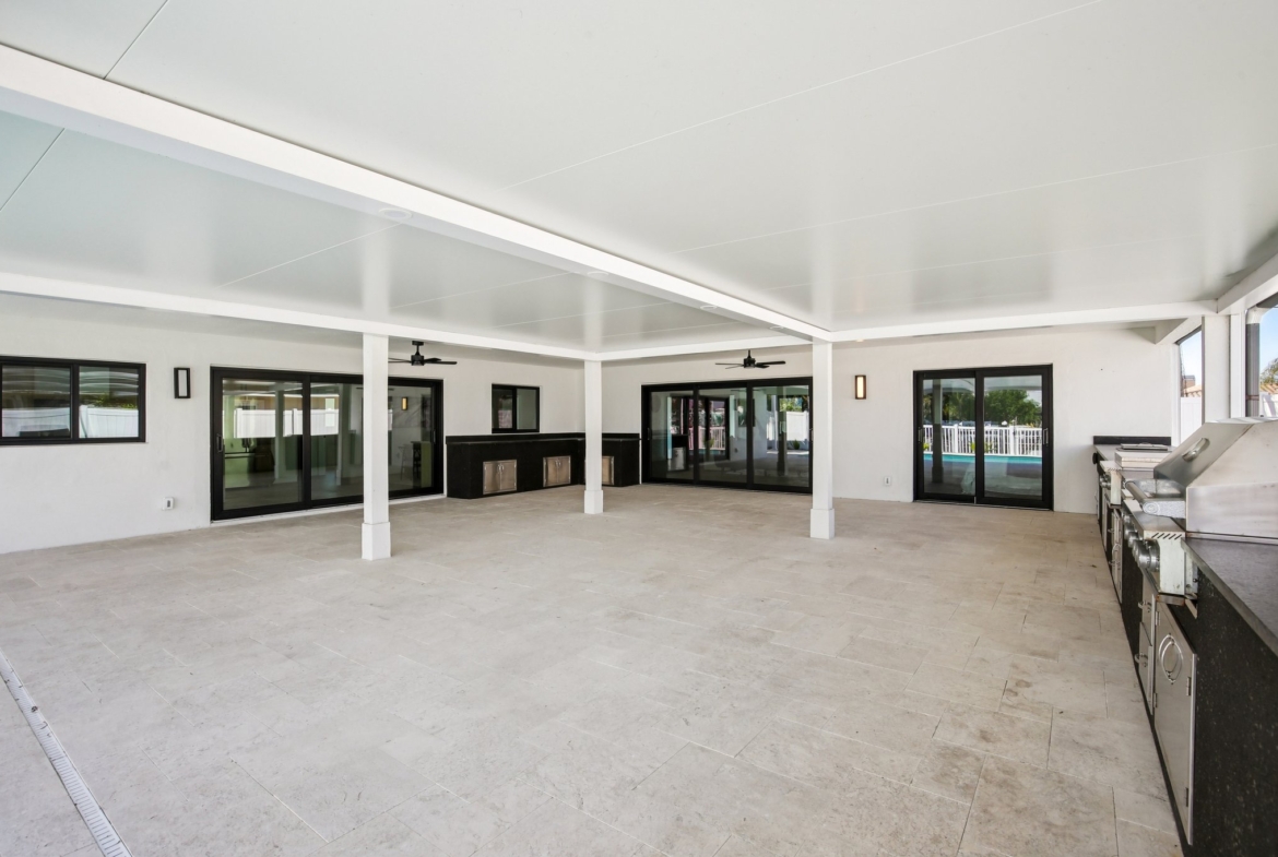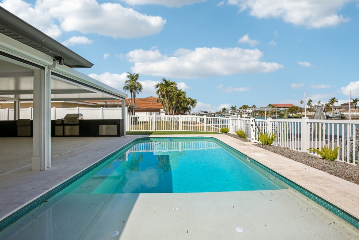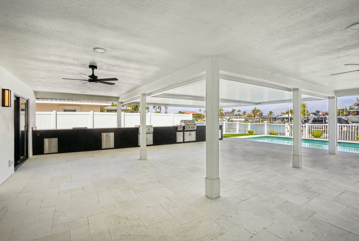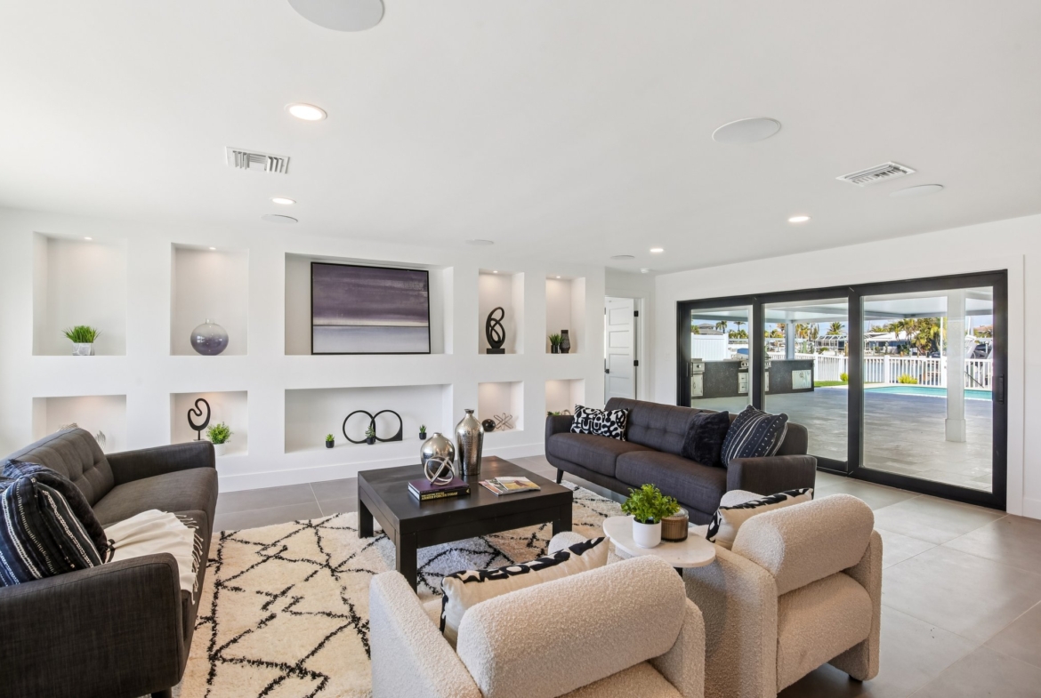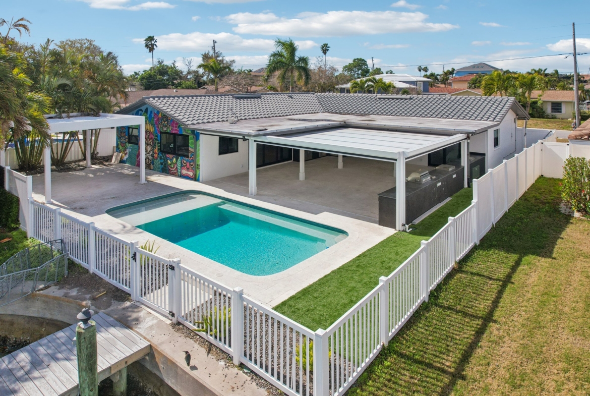 Welcome to 12125 5th St E, a masterpiece of waterfront engineering and design tucked away in the coveted Isle of Capri neighborhood of Treasure Island. This meticulously renovated 4-bedroom, 3-bathroom home seamlessly blends high-end luxury with the relaxed Florida boating lifestyle, situated just minutes from John’s Pass and the open waters of the Gulf of Mexico. Step inside to discover a stunning open concept defined by 12×24 tile flooring and a smart split floor plan that ensures privacy for the primary suite. The heart of the home is the completely renovated gourmet kitchen, featuring custom cabinetry, Cafe smart appliances, and breathtaking Taj Mahal Quartzite counters imported specifically from Brazil. Whether you are cooking for two or twenty, the flow is effortless, aided by Klipsch surround sound audio that runs throughout the home. The interior living space expands instantly via wall-to-wall sliding glass doors that open to an oversized back patio, creating the ultimate indoor-outdoor experience. Here, you will find a one-of-a-kind mural hand-painted by the renowned Vitali Brothers, serving as the backdrop to your entertaining haven. The incredible outdoor kitchen is equipped with top-tier TrueFlame components—including a 4-burner grill, warmer, and flat top—while split seating areas offer ample room to enjoy the water views. Boating enthusiasts will appreciate the brand-new Trex composite dock and the 12,000-lb boat lift. Peace of mind is standard here, with a newer seawall cap and bulkhead, a Trane HVAC (2022), a new water heater, and windows/sliding glass doors all replaced in 2022. The bathrooms are equally impressive, featuring Vanfoxle shower systems and Moen fixtures. Located moments from fine dining, shopping, and white sandy beaches, this turn-key residence offers the best of Treasure Island living.