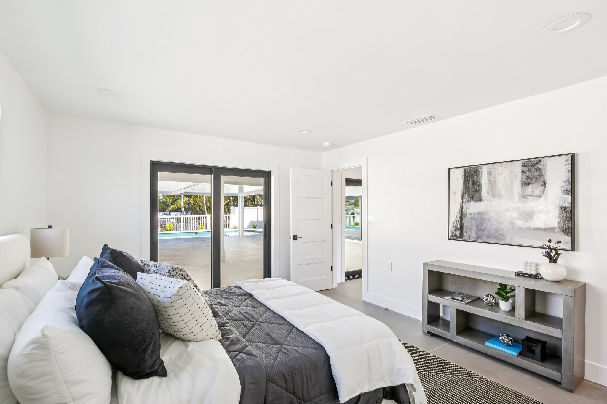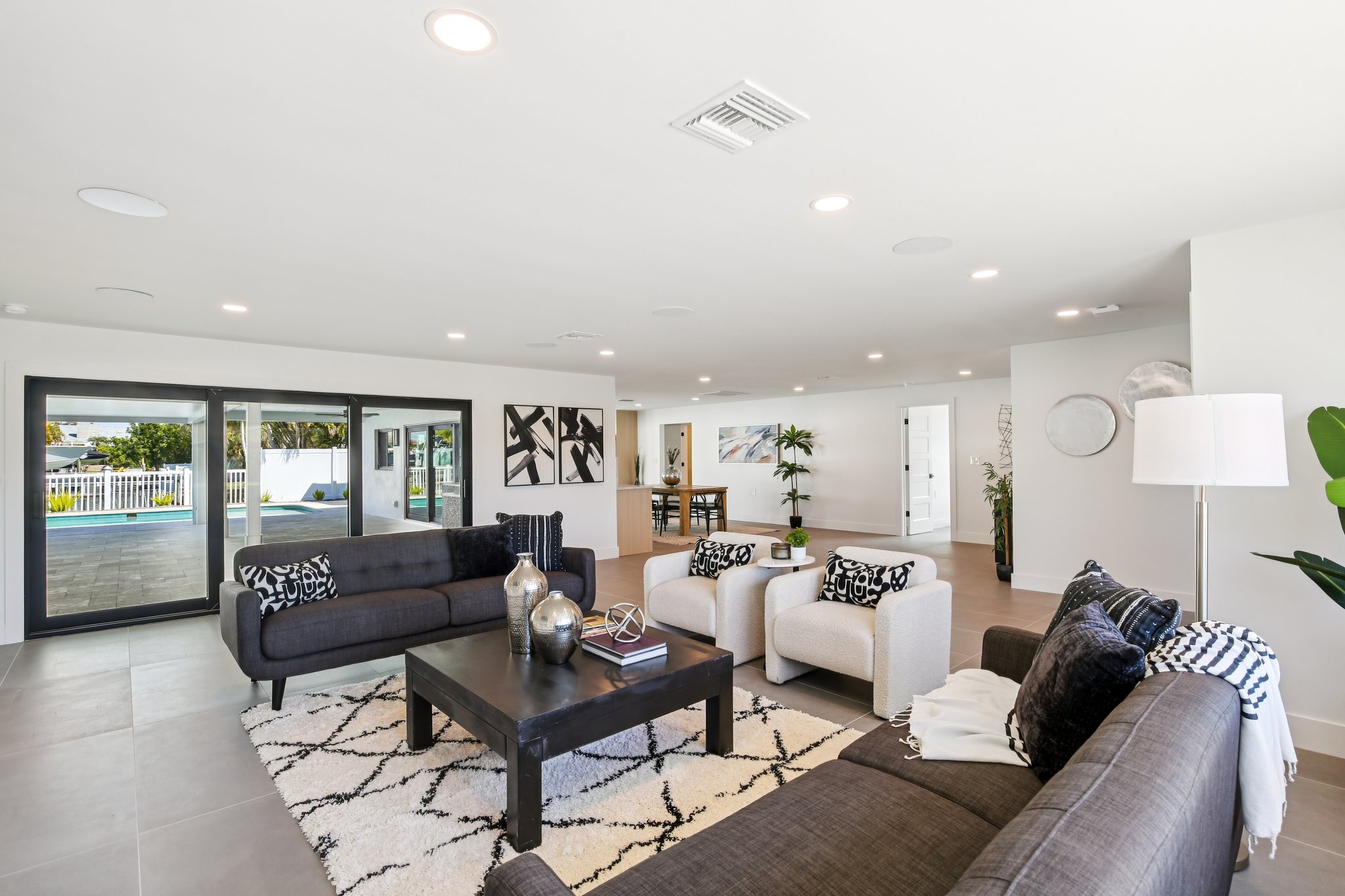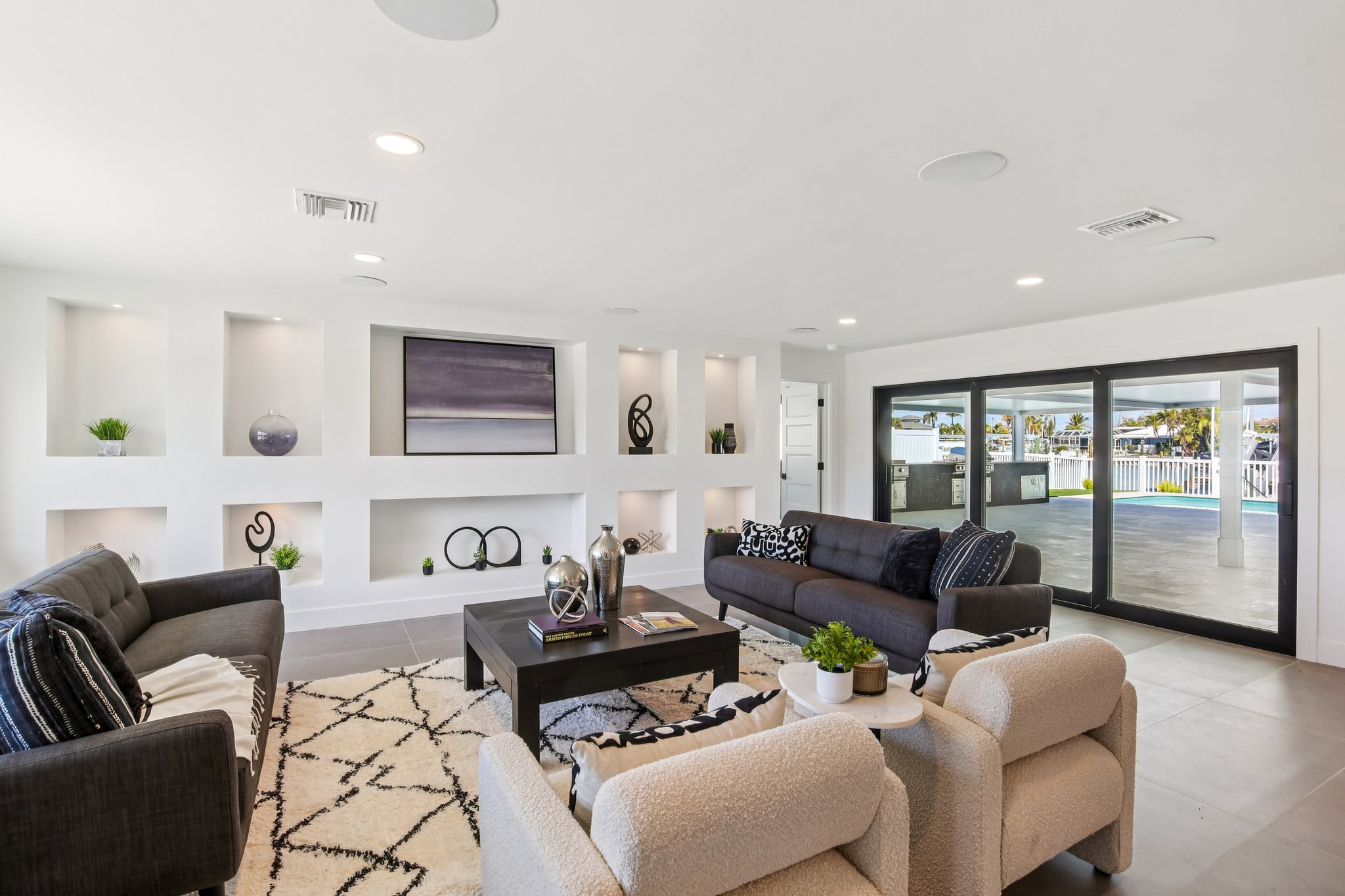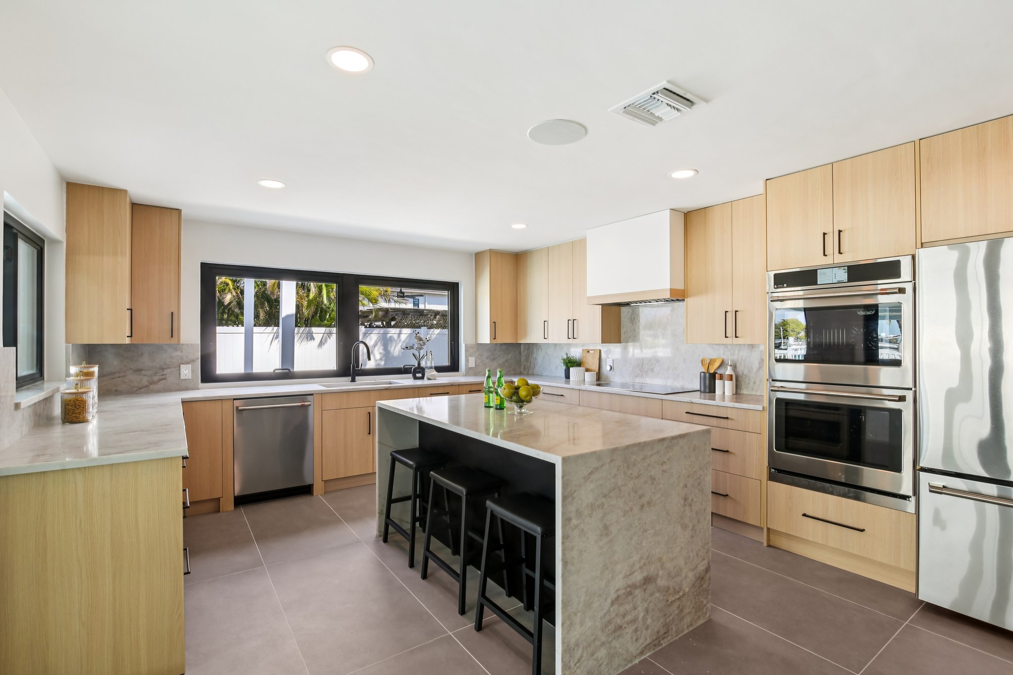 Welcome to 12125 5th St E, a masterpiece of waterfront engineering and design tucked away in the coveted Isle of Capri neighborhood of Treasure Island. This meticulously renovated 4-bedroom, 3-bathroom home seamlessly blends high-end luxury with the relaxed Florida boating lifestyle, situated just minutes from John’s Pass and the open waters of the Gulf of Mexico. Step inside to discover a stunning open concept defined by 12×24 tile flooring and a smart split floor plan that ensures privacy for the primary suite. The heart of the home is the completely renovated gourmet kitchen, featuring custom cabinetry, Cafe smart appliances, and breathtaking Taj Mahal Quartzite counters imported specifically from Brazil. Whether you are cooking for two or twenty, the flow is effortless, aided by Klipsch surround sound audio that runs throughout the home. The interior living space expands instantly via wall-to-wall sliding glass doors that open to an oversized back patio, creating the ultimate indoor-outdoor experience. Here, you will find a one-of-a-kind mural hand-painted by the renowned Vitali Brothers, serving as the backdrop to your entertaining haven. The incredible outdoor kitchen is equipped with top-tier TrueFlame components—including a 4-burner grill, warmer, and flat top—while split seating areas offer ample room to enjoy the water views. Boating enthusiasts will appreciate the brand-new Trex composite dock and the 12,000-lb boat lift. Peace of mind is standard here, with a newer seawall cap and bulkhead, a Trane HVAC (2022), a new water heater, and windows/sliding glass doors all replaced in 2022. The bathrooms are equally impressive, featuring Vanfoxle shower systems and Moen fixtures. Located moments from fine dining, shopping, and white sandy beaches, this turn-key residence offers the best of Treasure Island living.