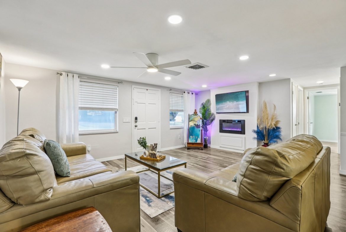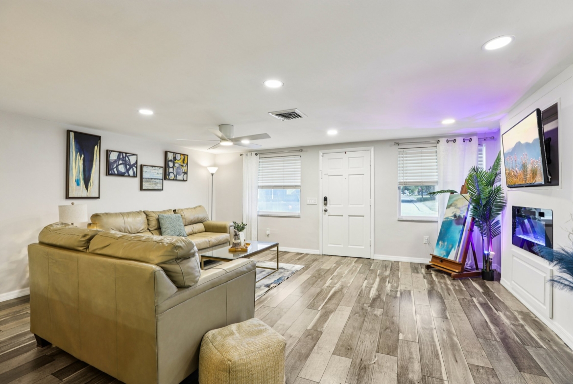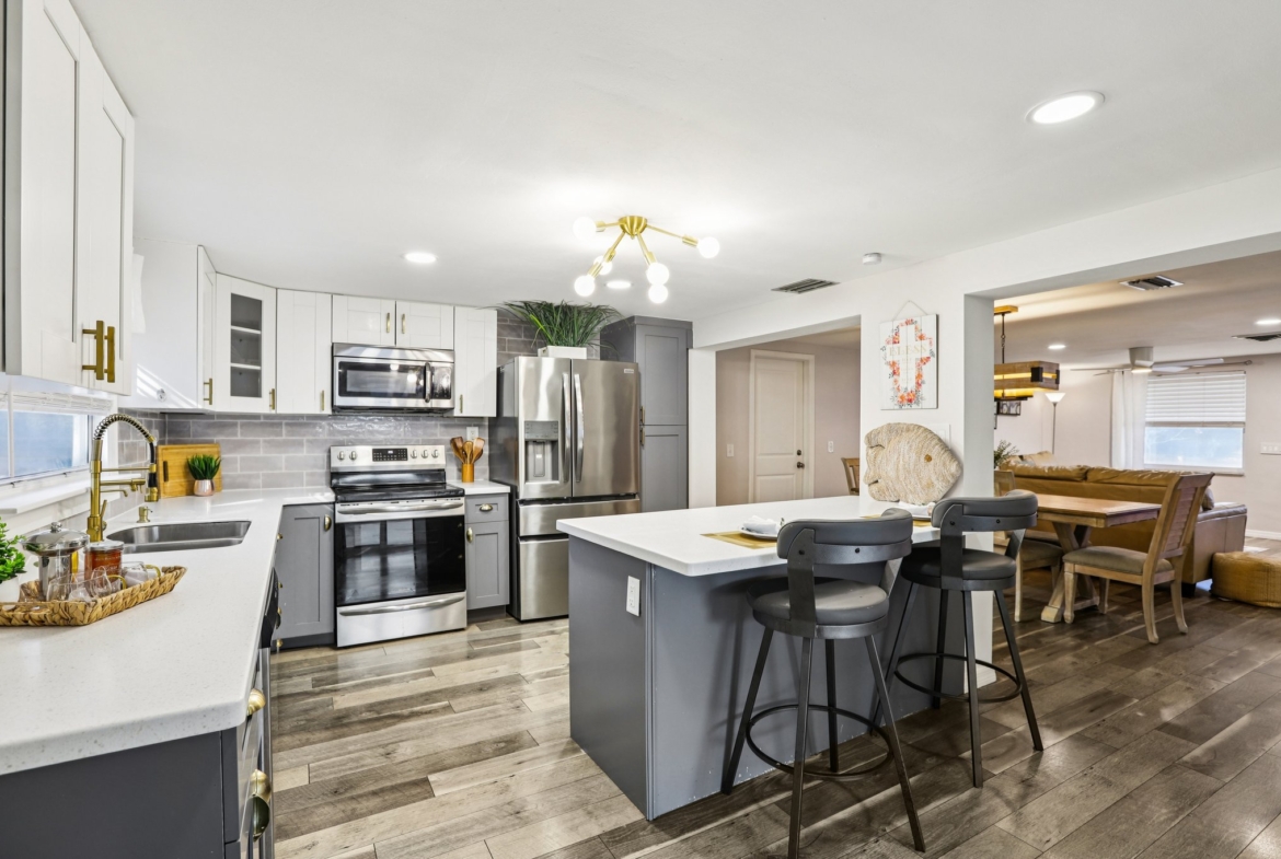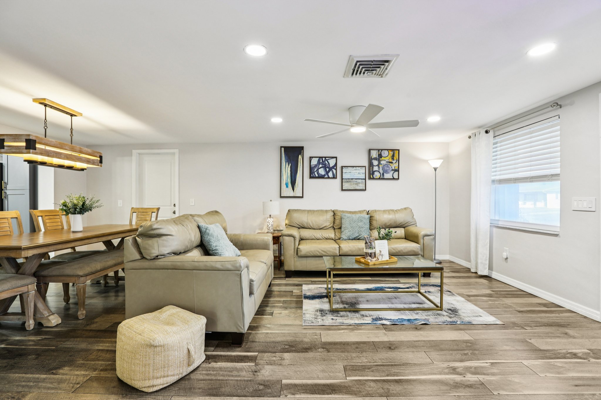 One or more photo(s) has been virtually staged. NOT IN A FLOOD ZONE ! Step into a home that feels warm, comfortable, and beautifully refreshed from top to bottom. This fully renovated residence showcases thoughtful design choices that blend modern style with everyday ease. The gorgeous kitchen takes center stage with solid surface counters, sleek grey cabinetry, a generous island, and stainless steel appliances that make cooking and gathering a joy. Laminate flooring flows throughout, creating a cohesive and inviting atmosphere. Practical upgrades add peace of mind, including a top tier roof that is eight years old, a tankless water heater, and an irrigation system on a well that keeps the yard looking its best without added cost. Smart lighting in the main areas adds convenience and enhances the home’s modern feel. A screened porch offers the ideal spot to enjoy morning coffee or unwind in the shade, while the privacy fenced backyard creates a quiet outdoor retreat complete with a shed for extra storage. The garage has been converted into a bonus room that provides flexible space for work, play, or hobbies and sits just off the kitchen for convenient everyday access. With its warm character, modern finishes, thoughtful upgrades, and versatile layout, this home is ready to welcome its next owner. List Agent is Owner: Contact for Private Showings