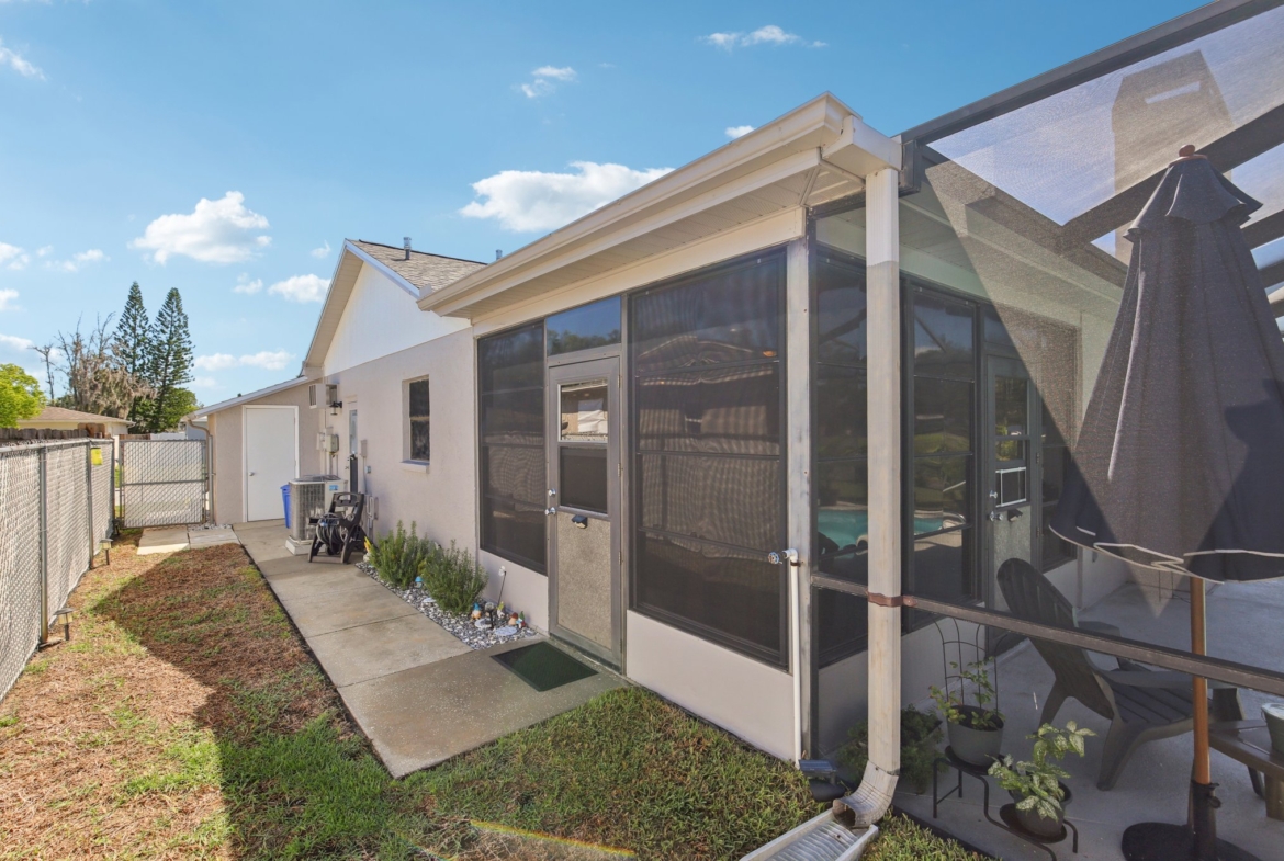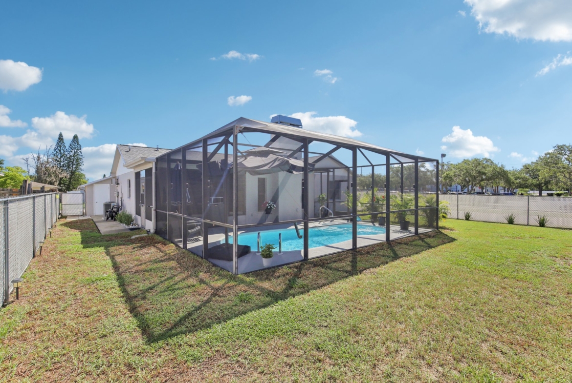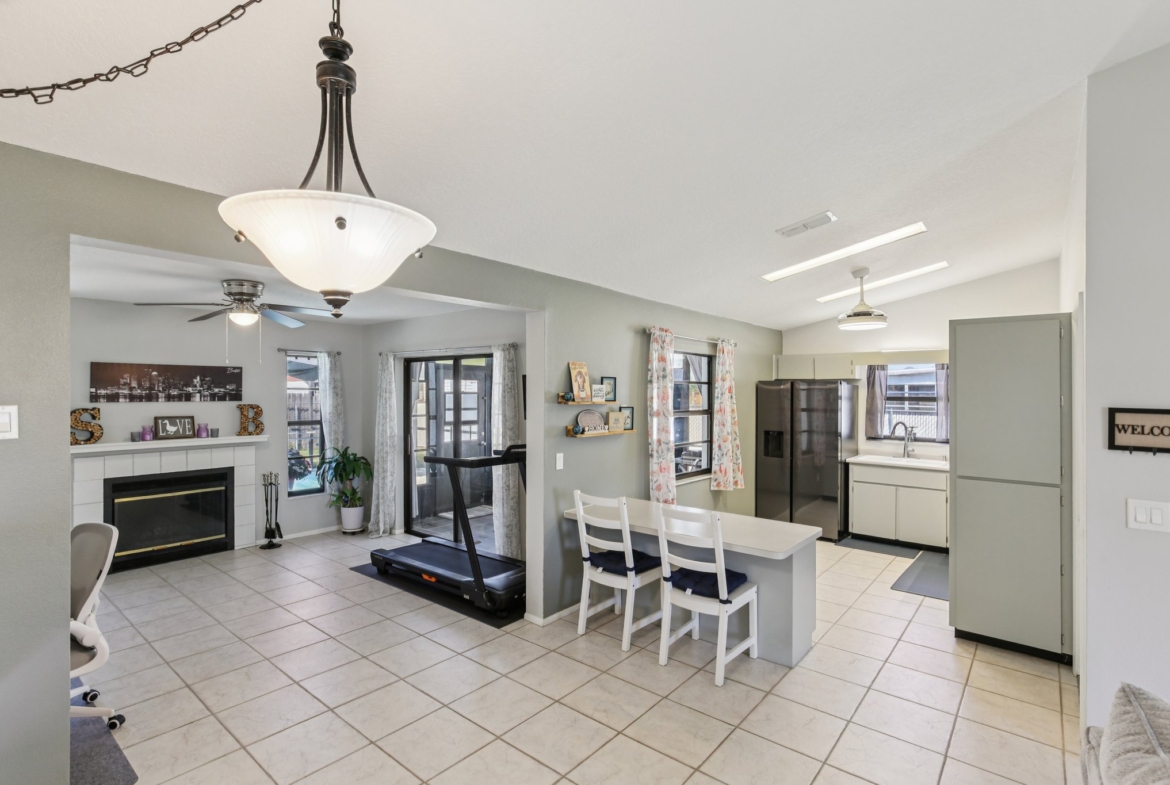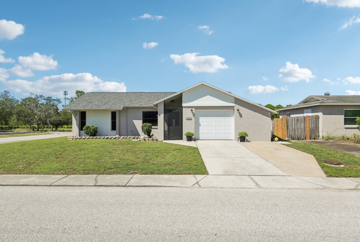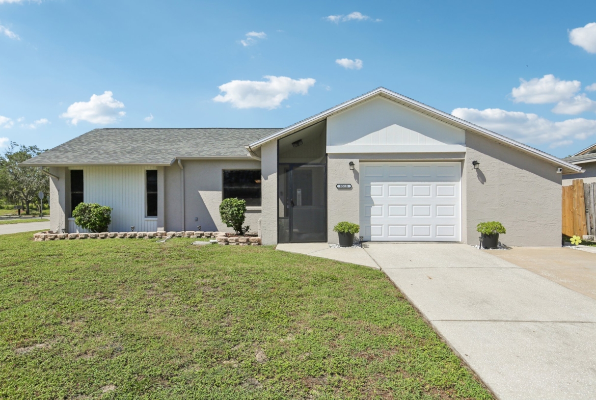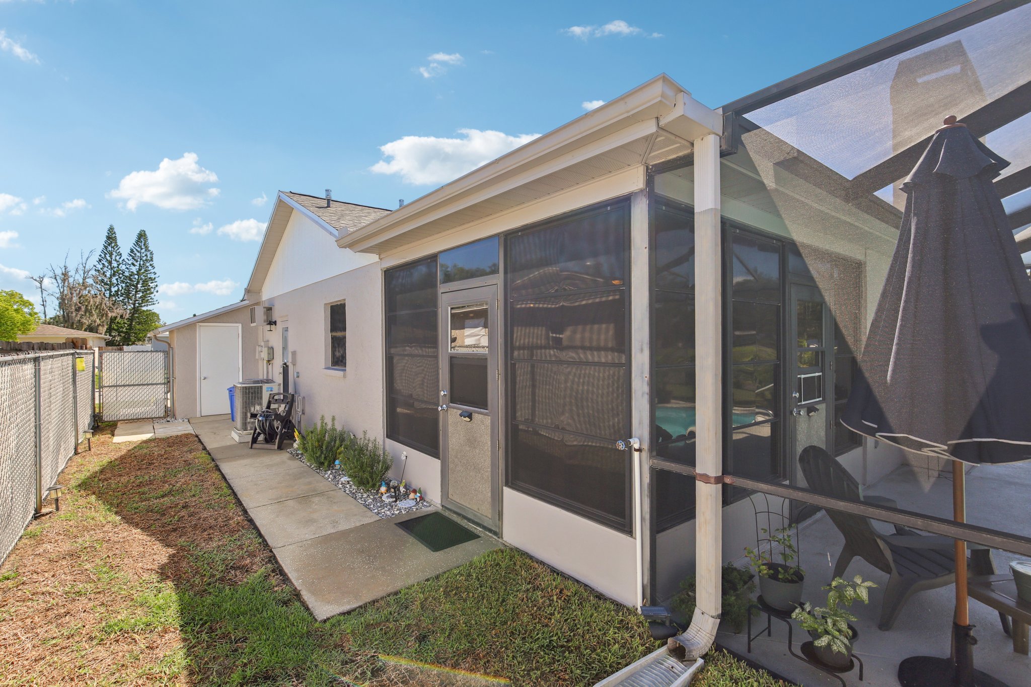 Welcome to this well-maintained 2-bedroom, 2-bath pool home with a 1-car garage, ideally located in Pasco. This home offers a bright, open floor plan with cathedral and vaulted ceilings that create a spacious and inviting atmosphere. The living areas feature updated porcelain tile flooring, while the bedrooms have wood laminate. Both bathrooms are finished with ceramic tile. The family room includes a fireplace and sliding glass doors that lead to a large Florida room and a screened in-ground pool. The pool area is surrounded by cool deck surfacing, making it a great space for relaxing or entertaining. The kitchen provides ample cabinet space, generous countertops, appliances, and a convenient breakfast bar for casual dining. The oversized garage includes a workbench, A/C, and peel-and-stick wood-look flooring, making it ideal for use as a workshop. It also houses a matching black stainless steel Whirlpool washer and dryer set from October 2023, which will stay with the home. On the side of the garage, you’ll find an attached storage shed with power for added convenience. Located close to shopping, restaurants, the library, and public transportation, this home offers comfort, space, and a great Florida lifestyle. Schedule your visit today!