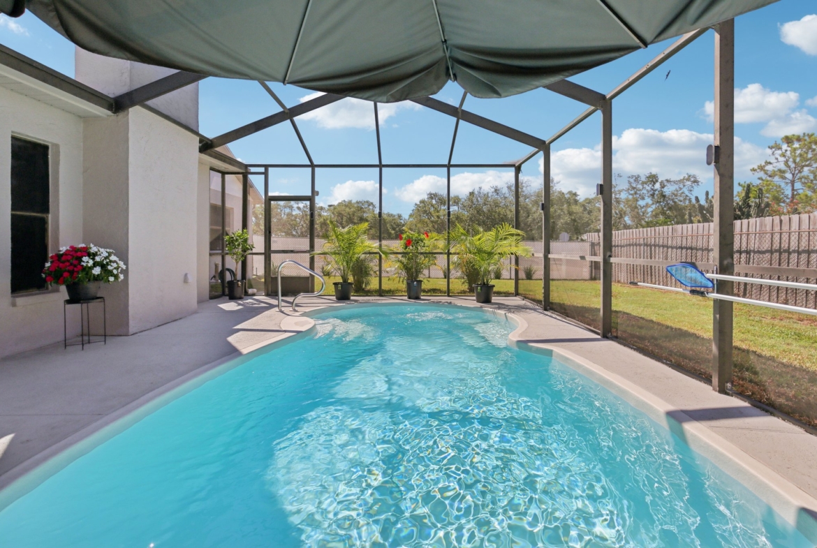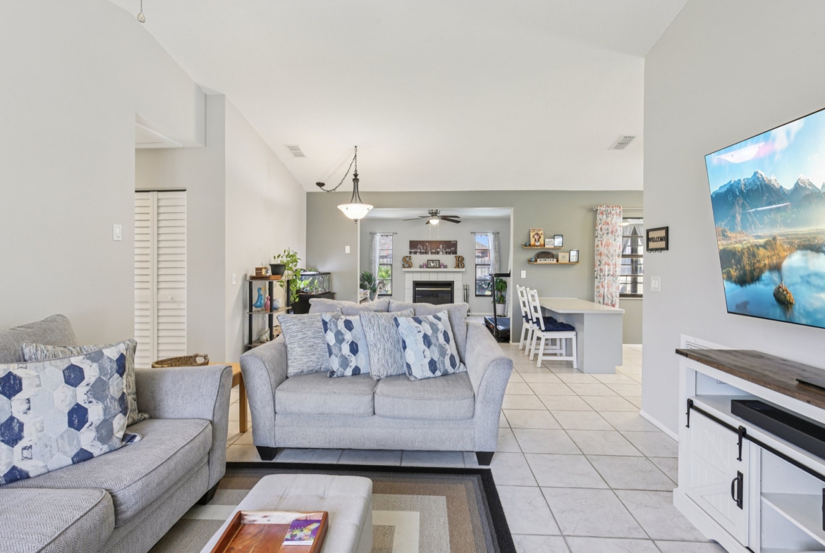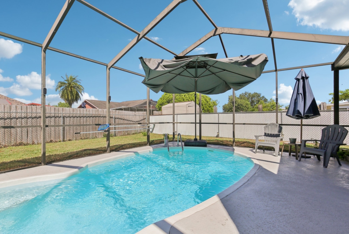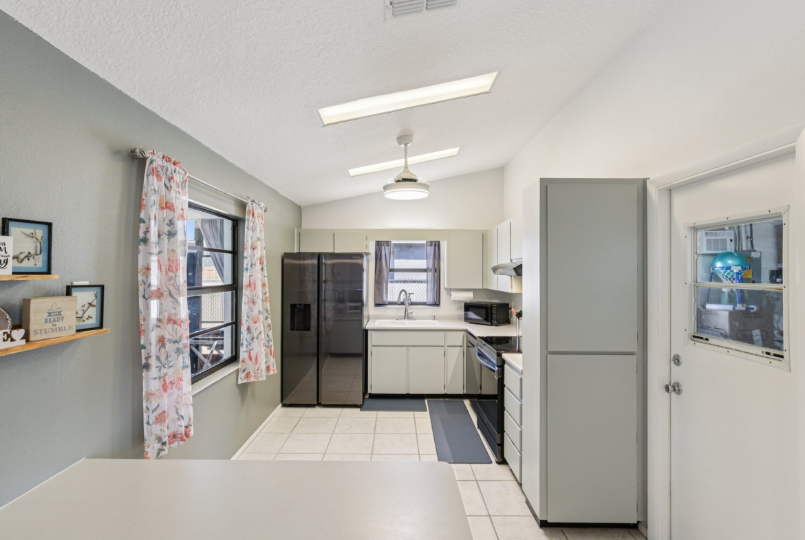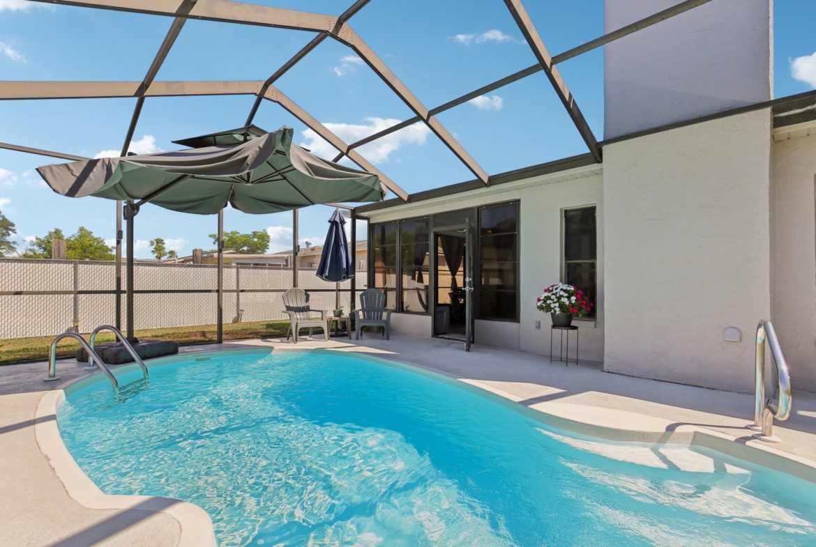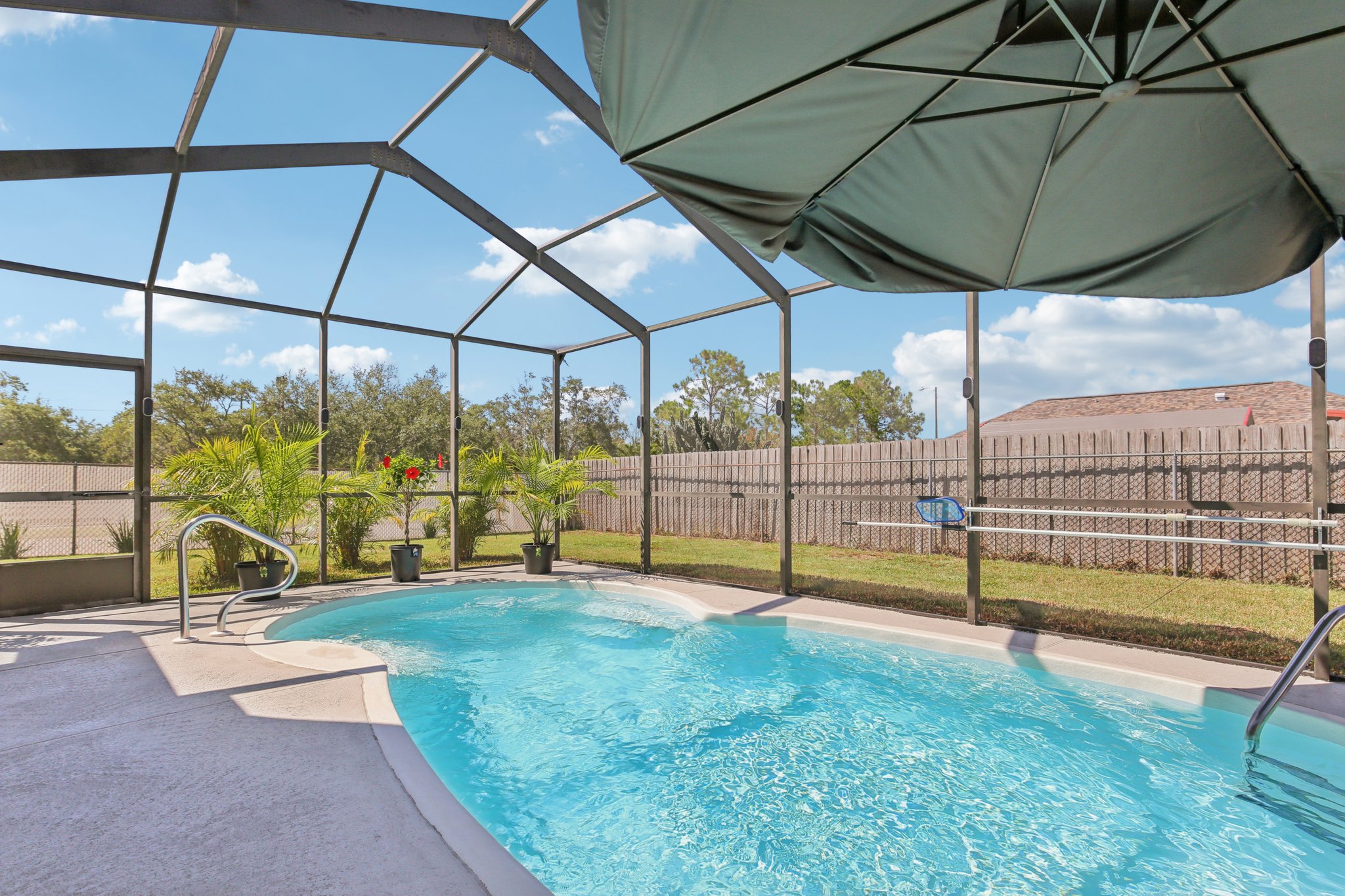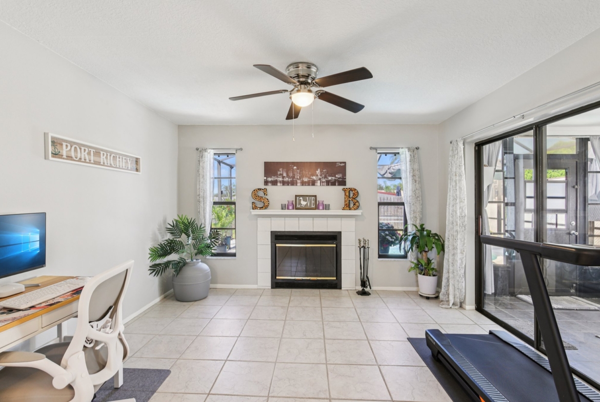Welcome to this well-maintained 2-bedroom, 2-bath pool home with a 1-car garage, ideally located in Pasco. This home offers a bright, open floor plan with cathedral and vaulted ceilings that create a spacious and inviting atmosphere. The living areas feature updated porcelain tile flooring, while the bedrooms have wood laminate. Both bathrooms are finished with ceramic tile. The family room includes a fireplace and sliding glass doors that lead to a large Florida room and a screened in-ground pool. The pool area is surrounded by cool deck surfacing, making it a great space for relaxing or entertaining. The kitchen provides ample cabinet space, generous countertops, appliances, and a convenient breakfast bar for casual dining. The oversized garage includes a workbench, A/C, and peel-and-stick wood-look flooring, making it ideal for use as a workshop. It also houses a matching black stainless steel Whirlpool washer and dryer set from October 2023, which will stay with the home. On the side of the garage, you’ll find an attached storage shed with power for added convenience. Located close to shopping, restaurants, the library, and public transportation, this home offers comfort, space, and a great Florida lifestyle. Schedule your visit today!